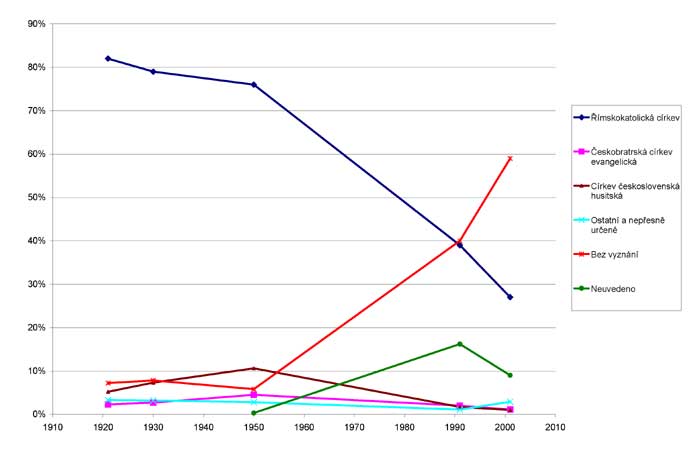 Z tohoto grafu můžeme vyčíst, že za posledních 50 let ubylo 50 % věřících, tj. jedno procento ročně. Když počítáme na Čechy 10 miliónů obyvatel, tak to znamená, že naši církev různým způsobem opustí každý den nějakých 274 lidí. V pražském semináři je celkem asi 10 seminaristů, kteří se chtějí stát kněžími, ale jen v pražské arcidiecézi 239 neobsazených farností (z 355, tj. 67 %). Naše obec (Líbeznice u Prahy) má přes 1500 obyvatel plus okolní vesnice, ale průměrná návštěvnost nedělní bohoslužby je necelých 30 lidí - 2 %, tj. praktikujících věřících v naší obci je asi tolik, jako je v ní schizofreniků či homosexuálů. (V tomto směru bohužel Líbeznice nejsou nijak vyjímečné.) Podle Vaší konstanty - 1400 věřících na kněze - tedy potřebujeme 47 vesnic jako jsou Líbeznice, aby vyprodukovaly jednoho kněze. Náš kněz ale sotva stačí objíždět 10 kostelů. Deset a kolik je 47...